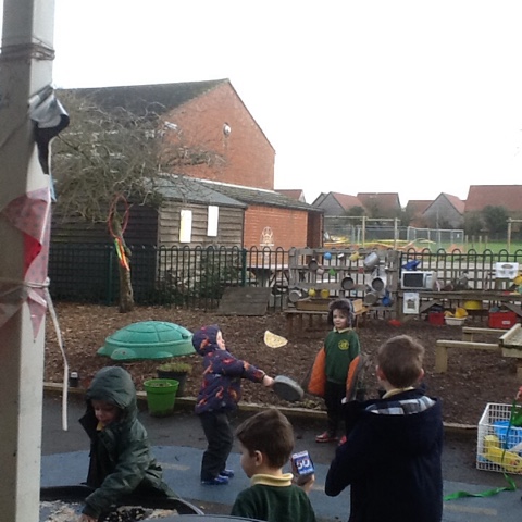 The children enjoyed having a go at tossing a pancake in our outside area. It was harder than it looked but great fun!